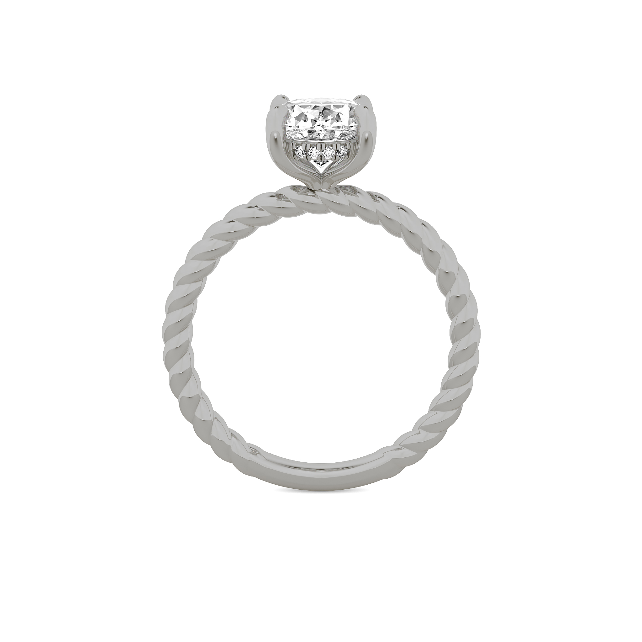 Engagement ring with hidden halo and braided shank. 2.1mm wide shank.