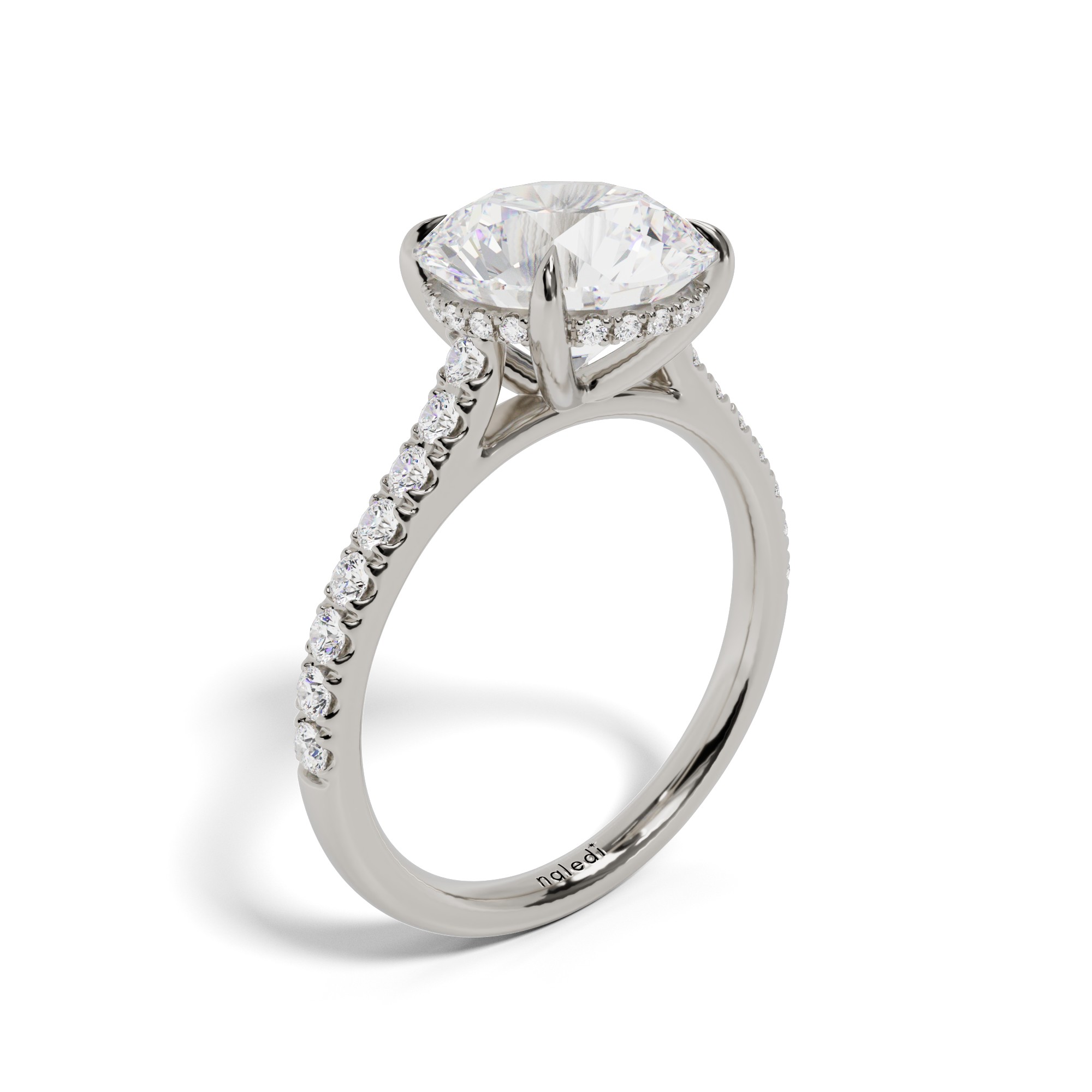 Engagement ring with a diamond cathedral shank and a hidden halo