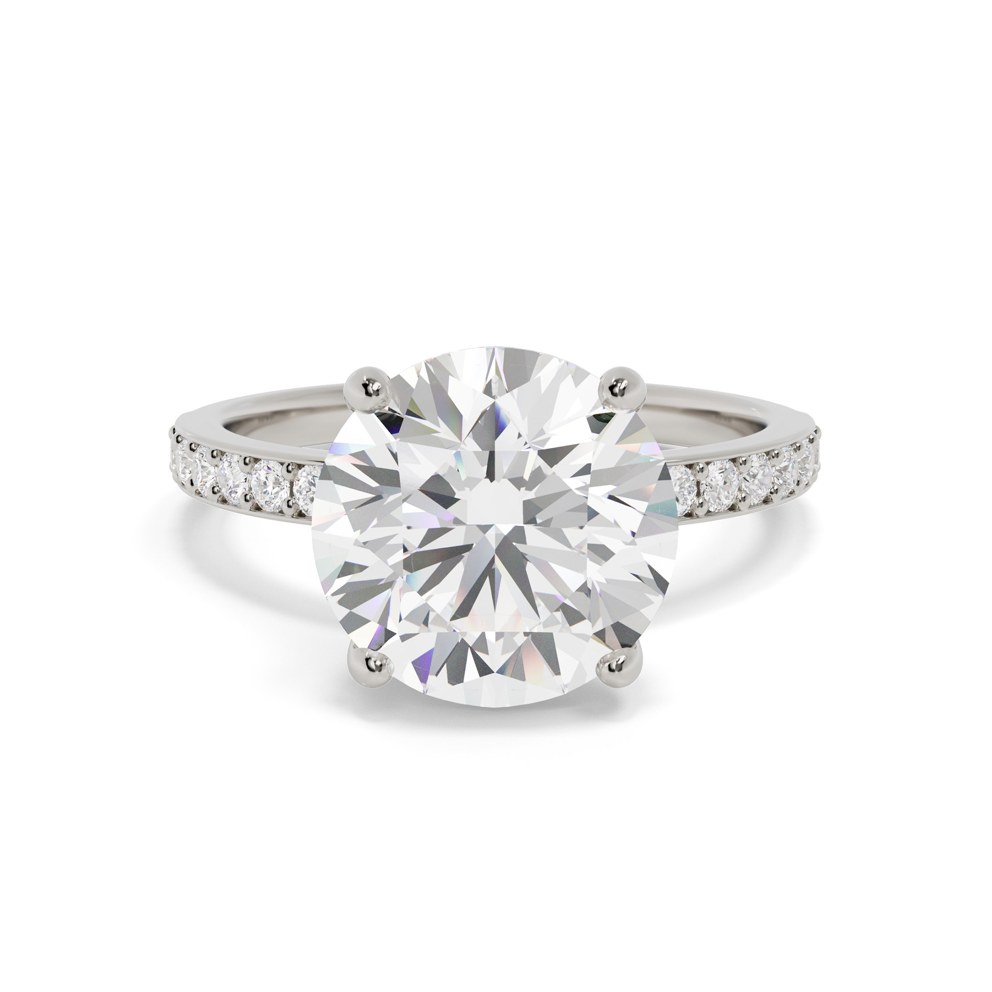 Elegant hidden halo with faux-channel diamond shank. 2.2mm wide shank.