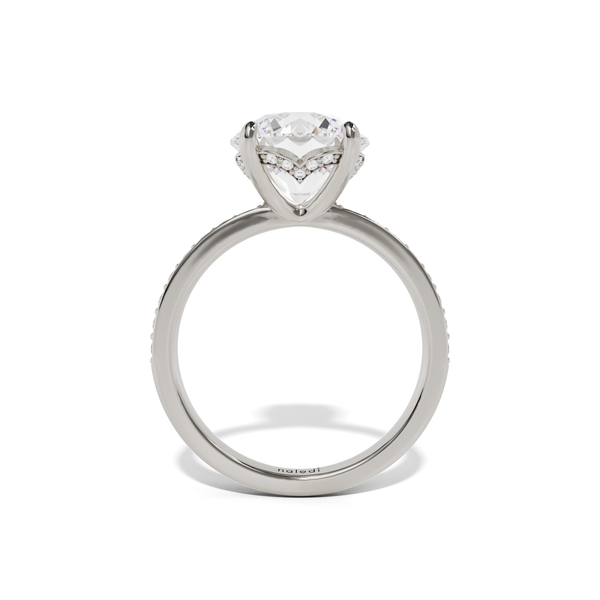 Elegant hidden halo with faux-channel diamond shank. 2.2mm wide shank.