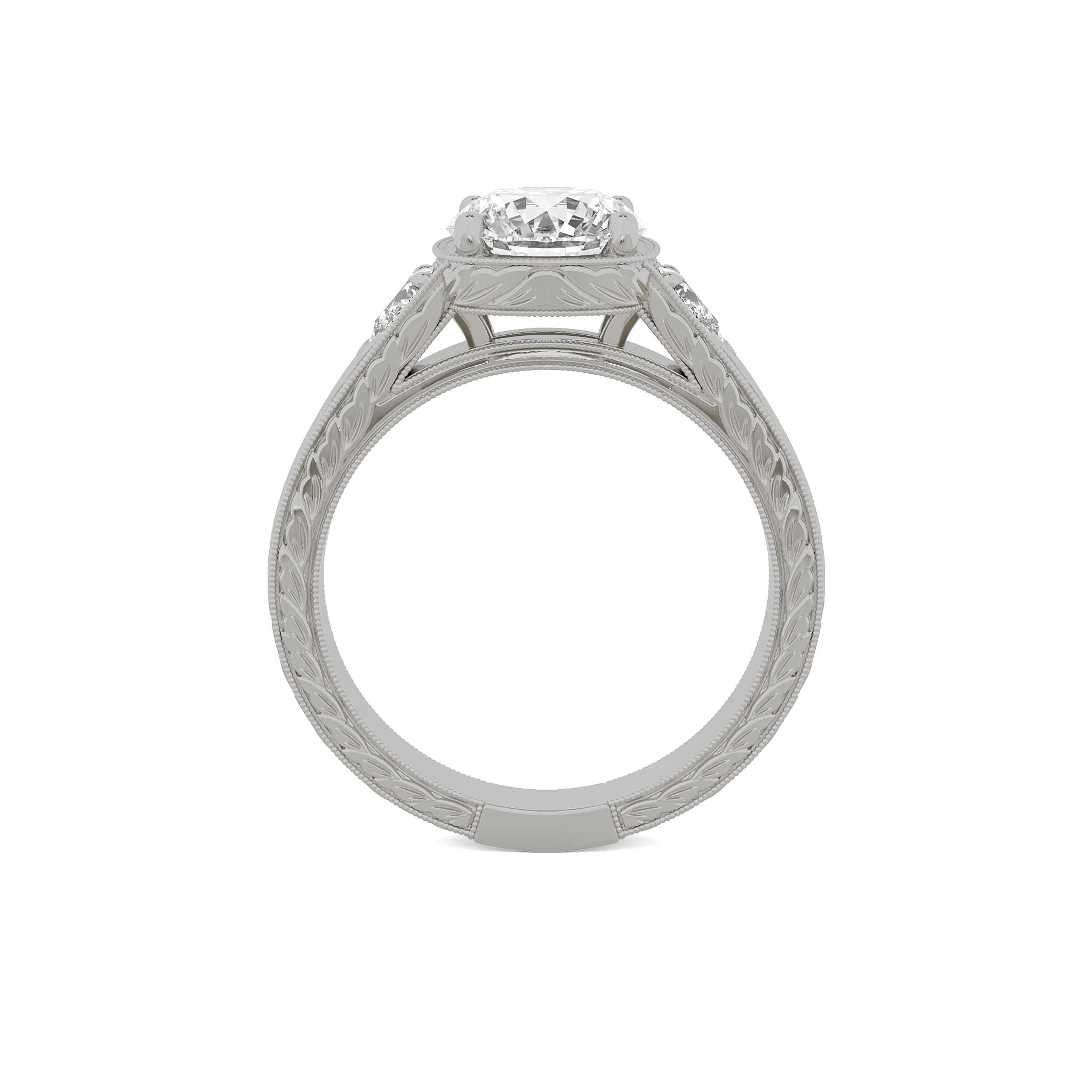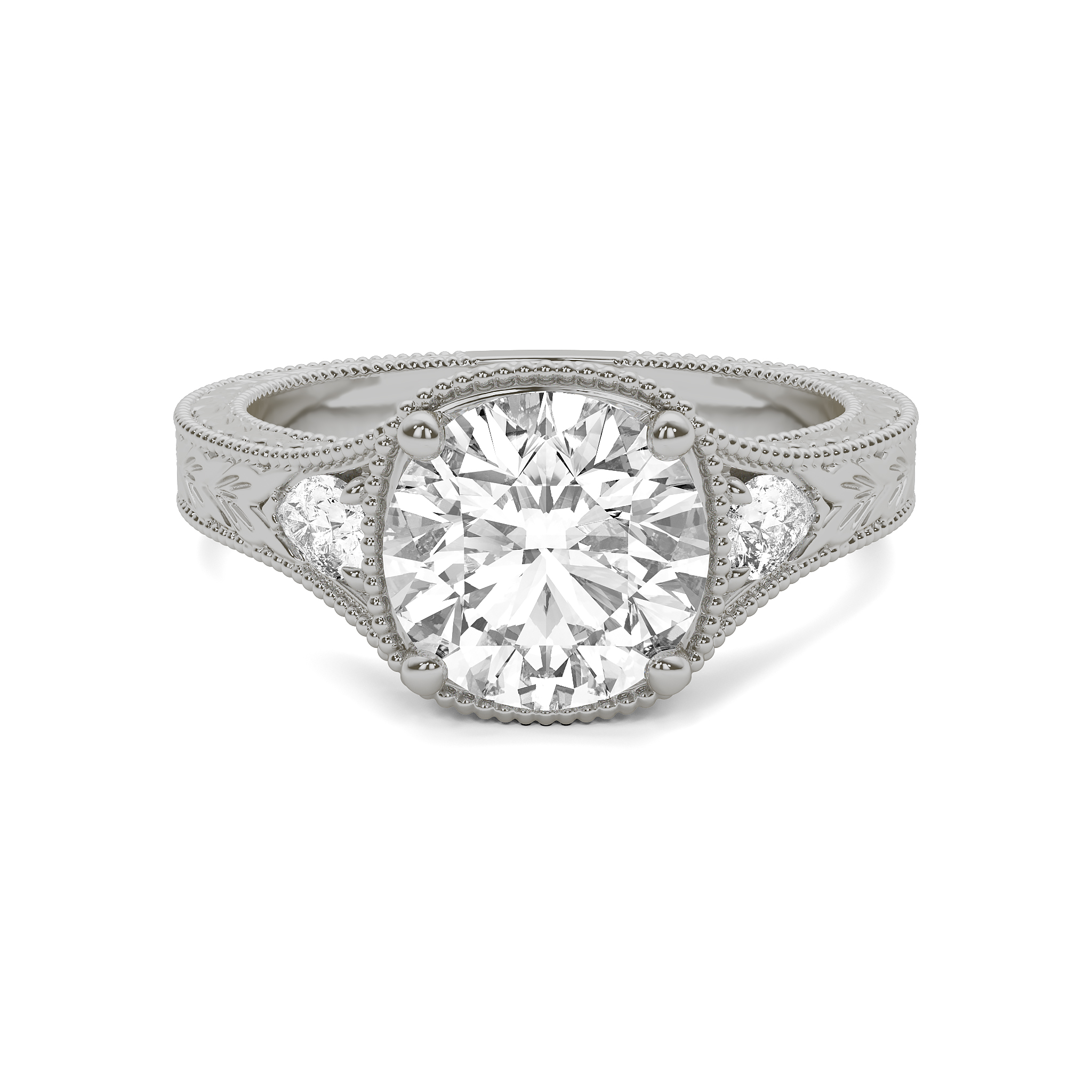 Engraved squared shank engagement ring with pear side stones. 2.4mm wide shank.